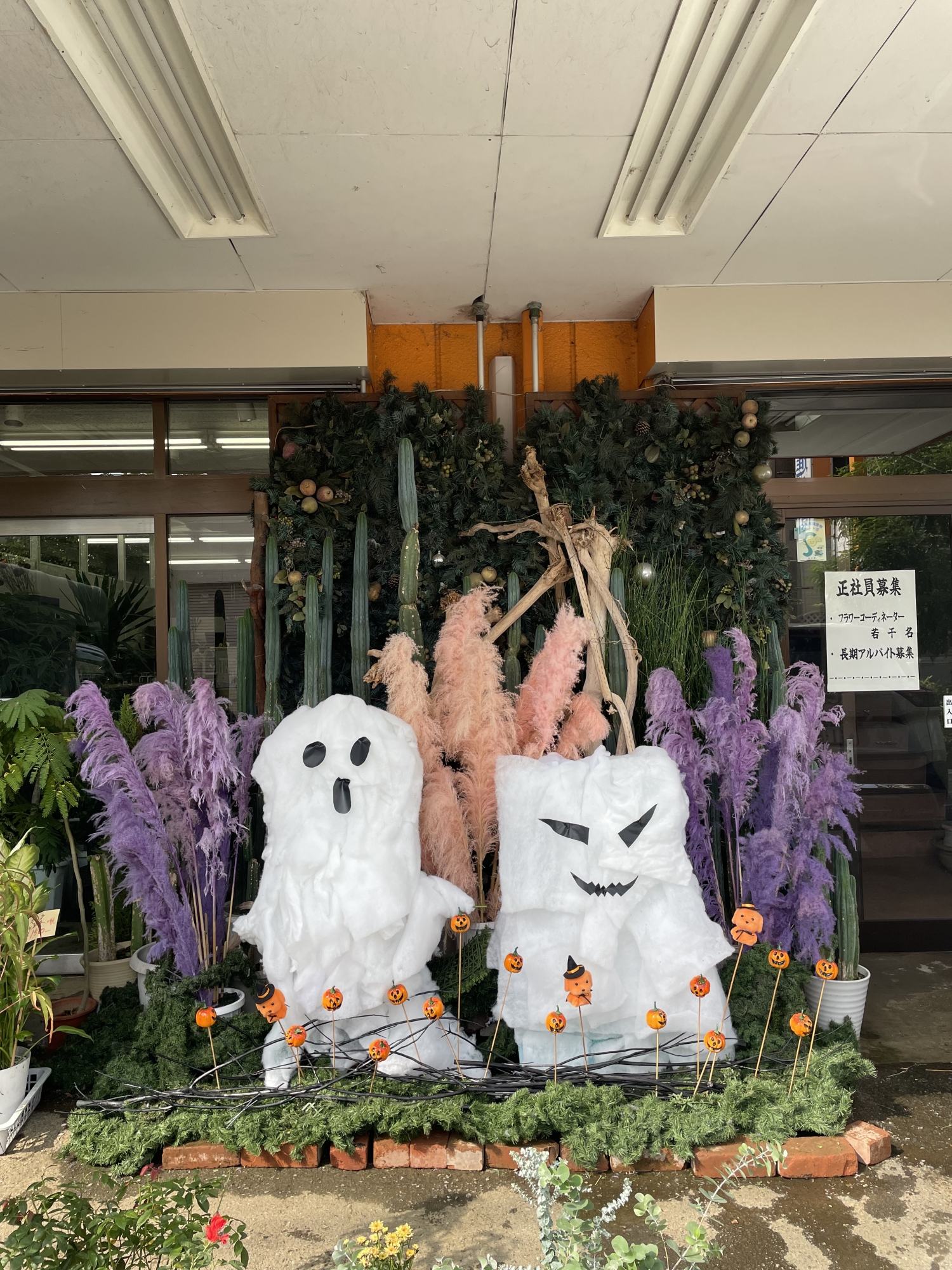 今回は、沢山の人形たちに囲まれてもひと際目立つヒマワリと、カーネーションで作ったありがとうの文字の花祭壇を作成しました!!